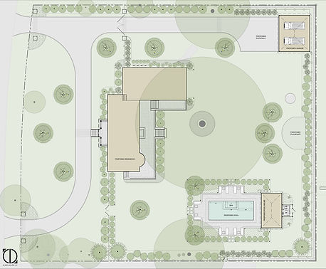 Right: Landscape Design Consulting was commissioned by the owner of this private residential estate in Scarsdale, New York, to create a master plan reflecting the merger of two adjacent lots; the shape, size, and layout of various structures including a new residence, detached garage, luxury in-ground swimming pool, pool house, and driveway; a perimeter fence that captures as much privacy and usable space around the residence as possible; and property-wide planting and lighting. The plan reflects conformity with various building codes and zoning restrictions governing the project.